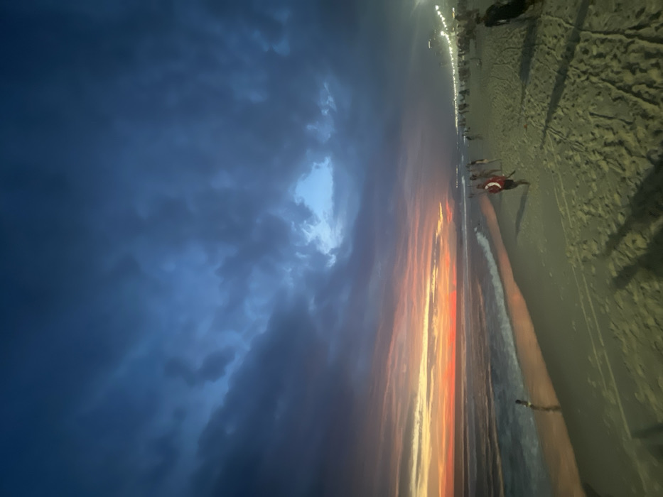 A beach scene at dusk. The sky is a mix of dark blue storm clouds and vibrant orange sunset streaks. The beach is sandy and stretches along the horizon, lined with dim lights. People are sparsely scattered, some near the water's edge. The perspective is slightly angled.