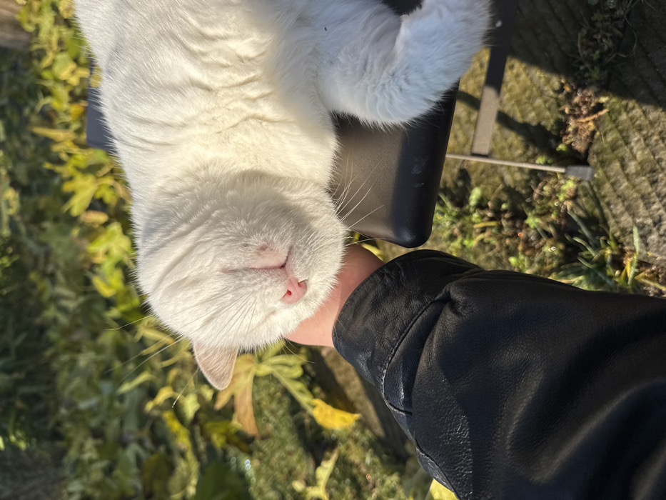 A white domestic cat is depicted in close-up, resting outdoors in Montepulciano, Italy. The cat, oriented horizontally across the upper right, has its eyes closed and its pink nose visible. Its head is gently cradled by a human hand, which extends from the lower left of the frame. The human's forearm is covered by a black leather jacket sleeve, exhibiting minor creases. The cat's body, primarily its torso and hindquarters, rests on a dark, padded surface, identifiable as a chair or bench seat, with a thin, grey metal support leg visible beneath it. The background consists of out-of-focus green and yellow foliage, illuminated by direct sunlight, which casts strong highlights on the cat's fur and the surrounding vegetation.