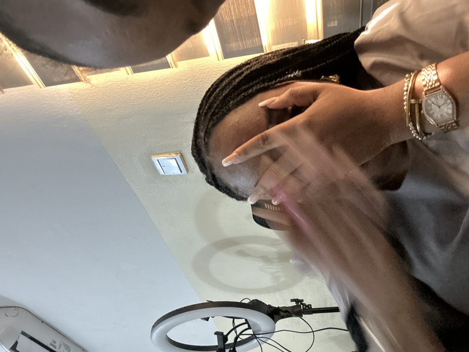 person with braided hair covering their face with one hand, wearing a watch and bracelets. The shot is taken from a low angle, revealing a light fixture above and a ring light below. The background appears to be a room interior with light-colored walls. The person is partially obscuring the camera with a portion of their body.