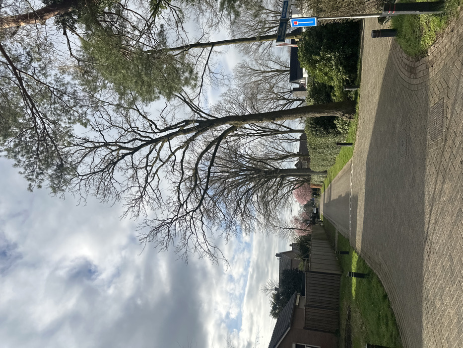 The image displays a residential street in Sint Anthonis, Netherlands, specifically identified by a street sign indicating "Kempkesstraat" and "Bernhardstraat" on the right. The ground is paved with light-colored rectangular bricks, forming a wider foreground area that transitions into a narrower road extending into the distance. Black bollards with reflective tops delineate the edges of the paved areas. Tall, bare deciduous trees, primarily indicating late winter or early spring, line both sides of the street, with evergreen pine trees visible in the upper right. On the left, a grassy strip separates the paving from a wooden fence and a house with a dark tiled roof. Further down the street on the left, a group of trees with distinct pink blossoms suggests early spring. On the right, a manicured green hedge runs along the road, partially obscuring buildings behind it. A blue traffic sign on the right, featuring a red rectangle with a white horizontal bar, typically denotes a dead-end street or no entry for through traffic. The sky above is partially cloudy, showing areas of white clouds and patches of blue. No individuals, animals, or vehicles are present in the scene.