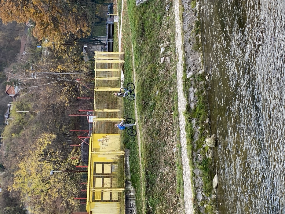 The image presents an autumnal outdoor scene within the city of Uzice, Serbia, viewed across a body of water. In the foreground, a river with visible surface ripples flows, bordered on the near side by a stone retaining wall topped with a cobblestone path. Above the path, a grassy bank slopes upwards. On this grassy bank, two individuals, likely adolescents, are positioned with their bicycles. The individual on the left wears a light-colored long-sleeved shirt, dark trousers, and a blue backpack, standing next to a dark-colored mountain bike. The individual on the right wears a dark top and light-colored trousers, standing beside a light green mountain bike. Both individuals are holding their respective bicycles. Behind the individuals, to the left, is a rectangular yellow utility building with two rectangular panels on its visible facade and some graffiti. Extending from this building to the right is a yellow metal mesh fence, segmented into multiple panels. Behind this fence, red structural elements are visible, suggesting a sports court or similar enclosed area. The background consists of a sloping hillside densely covered with deciduous trees, many displaying yellow and brown autumn foliage. Several residential structures with orange or grey roofs are visible interspersed among the trees on the hillside, along with utility poles. The sky is overcast and not distinctly visible.