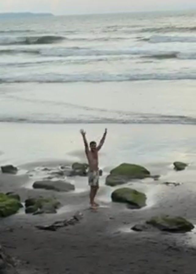 A man in patterned shorts stands on a beach with his arms raised. Rocks covered in green algae are scattered around him. The beach appears to be made of dark sand. The ocean stretches out behind him, with waves rolling towards the shore. The sky is overcast. A couple walks towards the shore near the man. The scene is brightly lit.