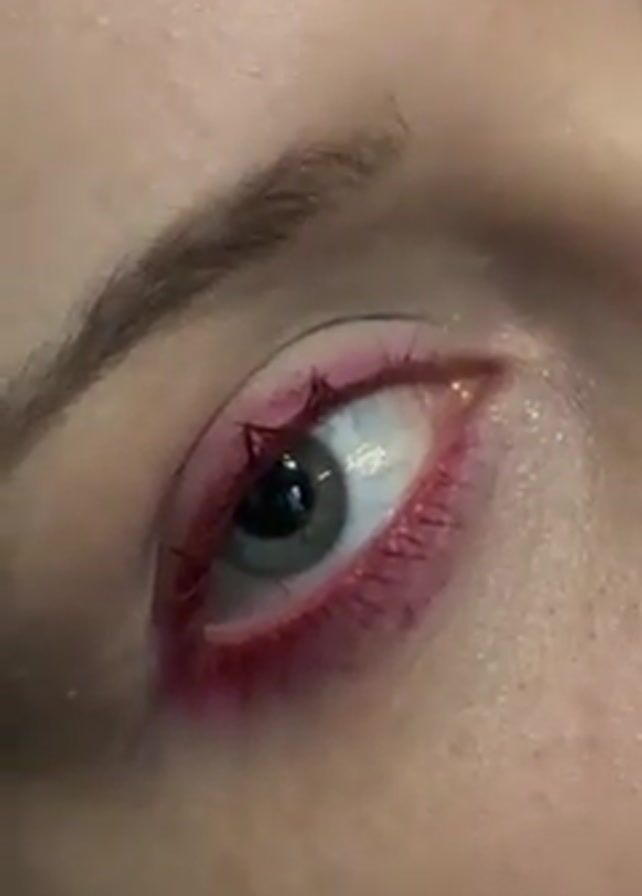 close-up of a person's eye with red and pink makeup around the eyelid and lower lash line
