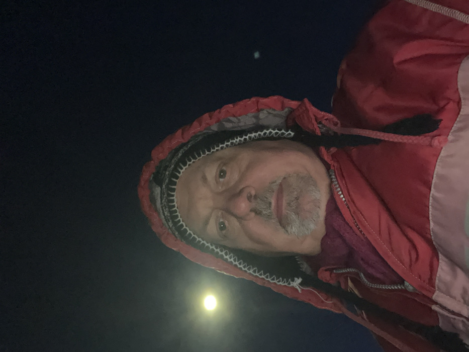 An upward-angled nighttime portrait depicts a single adult male subject, positioned centrally and looking directly into the camera. The subject is wearing a red hooded jacket with the hood up, revealing a black and white/light grey patterned inner lining and associated drawstrings. A dark reddish-purple scarf or garment is visible at the subject's neck. The subject exhibits a light skin tone and a goatee-style beard. The background consists of a dark, clear night sky. A bright, circular celestial body, consistent with the moon, is visible in the upper left background. A smaller, faint greenish-blue light is present in the upper right background. The scene is illuminated by an artificial light source directed at the subject. The location is Podolsk, Russia.