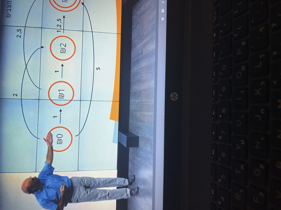 The image displays a close-up, downward-angled view of an HP laptop screen showing a video presentation, with the laptop's black, Hebrew-English QWERTY keyboard in the foreground. The video features an older Caucasian male, bald and wearing glasses, a light blue short-sleeved collared shirt with a lapel microphone, and light gray trousers. He stands on a stage with a dark wood-patterned floor, pointing with his right hand towards a large screen behind him. He holds a dark, rectangular object in his left hand. The screen displays a diagram with a light blue background, featuring multiple orange-bordered white circles, each containing the Hebrew letter "ש" followed by a number (e.g., "ש0", "ש1", "ש2"). Black arrows with numerical labels (e.g., "1", "2", "5", "1,2,5") connect these circles. The Hebrew word "מצבים" (states/situations) is visible in the upper right of the diagram. A black L-shaped object rests on the stage floor to the right of the speaker, and an orange graphic element is visible on the screen's lower portion. This scene is observed from the city of Ramat HaSharon, Israel.