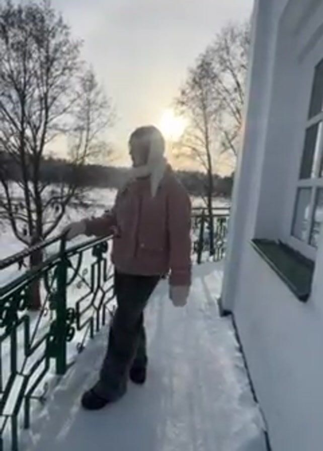 A young woman stands on a snow-covered porch in a winter landscape