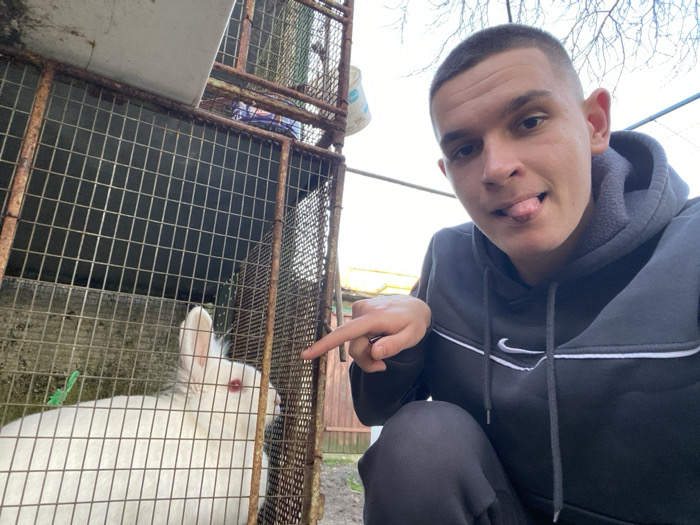 An outdoor scene in Dimitrovgrad, Bulgaria, depicts a young adult male interacting with a white rabbit contained within a rusted metal wire cage