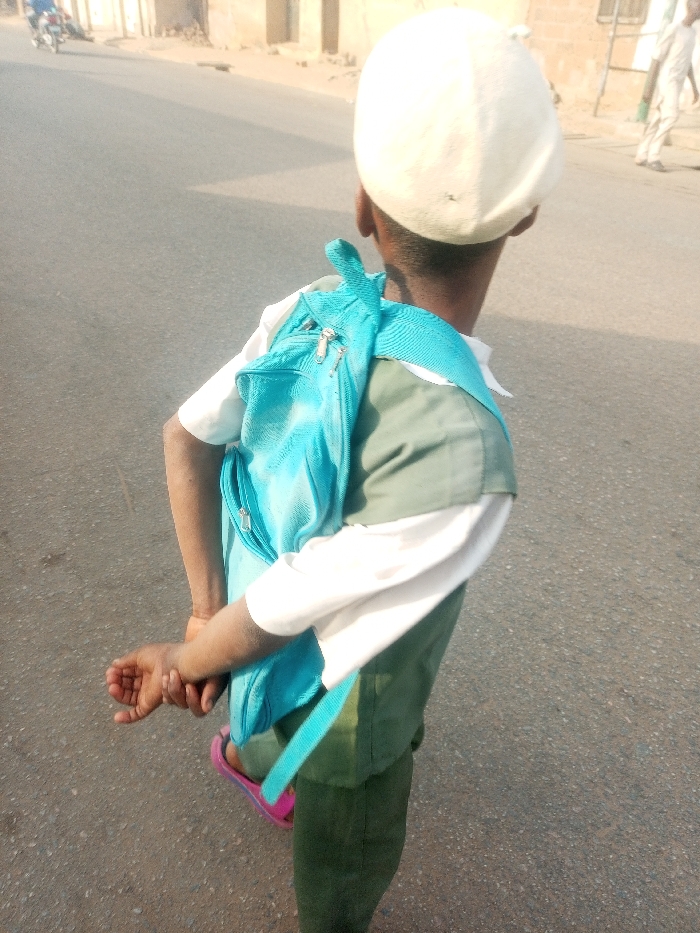 A young boy wearing a white cap, light-colored shirt with short sleeves, and dark green vest and pants, walks down a paved road carrying a bright turquoise backpack. His hands are clasped behind his back. He is wearing pink sandals. Buildings are visible in the background, and a motorcycle is moving in the opposite direction. Another person walks off in the distance. The light is bright, and the overall tone of the image is muted and hazy.