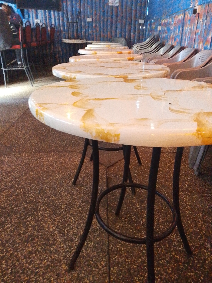 This image depicts the interior of an establishment in Nairobi, Kenya. The foreground is dominated by a row of round, white-topped tables featuring prominent gold or yellowish abstract patterns, resembling liquid stains or intentional decoration. These tables are supported by black metal bases with four legs and a circular footrest, receding in perspective towards the right background. On the far left, a solitary individual is partially visible, seated on a red-backed bar stool with a black frame. The person is dressed in dark attire, with only their lower body and an arm discernible. In the middle-right background, a stack of multiple beige or light-colored plastic chairs with perforated backs is visible. The background wall consists of corrugated metal sheeting painted blue, interspersed with sections that appear to have horizontal wooden slats or mottled blue and orange/brown patterns. The floor is a dark, speckled terrazzo or concrete surface. The lighting suggests an indoor setting, possibly with artificial illumination causing reflections on the table surfaces. No specific actions or interactions beyond the single seated individual are clearly depicted, and the tables appear largely unoccupied.