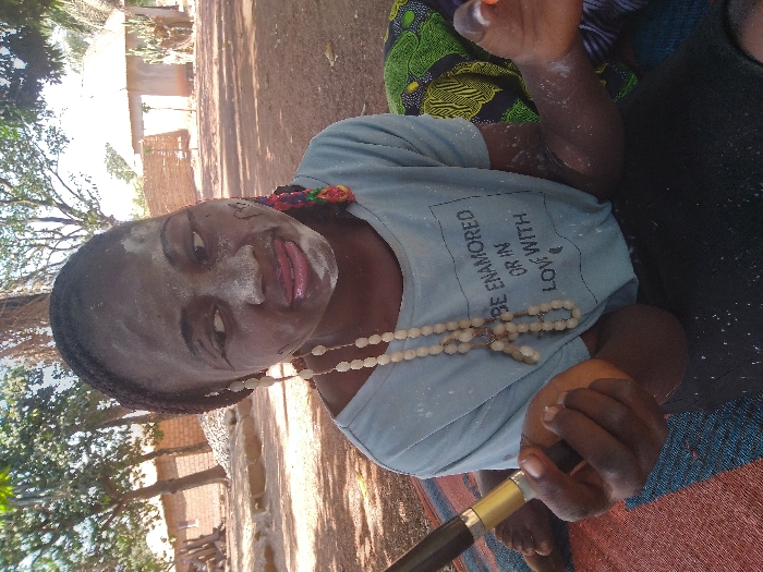 An individual with dark skin, possibly female, is seated outdoors on a patterned mat in Godogodo, Nigeria