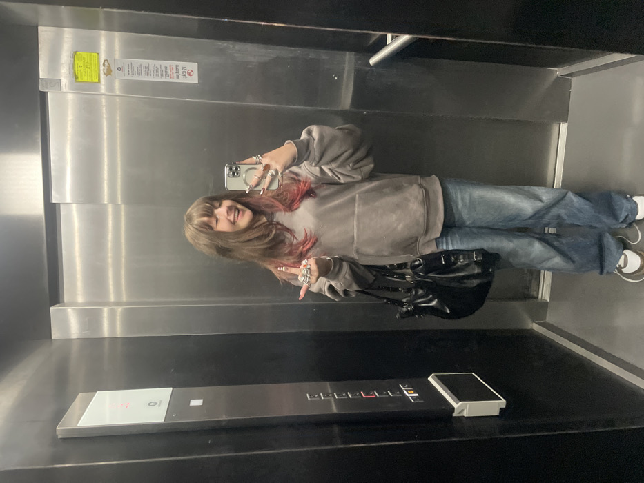 A woman takes a mirror selfie in an elevator. She has long, light brown hair with red highlights and wears a gray hoodie and blue jeans. She makes a peace sign with both hands, adorned with multiple rings. Her black handbag hangs from her shoulder. The elevator features stainless steel walls with an operational panel displaying floor numbers and a safety sign.