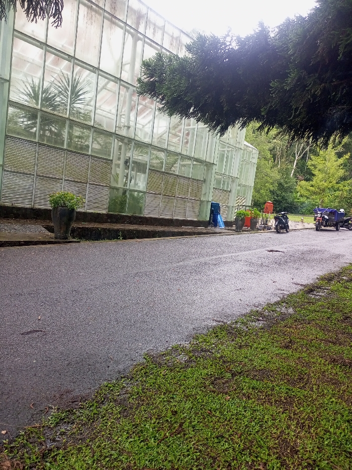 This image depicts an exterior scene in Beni, Nepal, featuring a large, multi-paneled glass greenhouse on the left. The greenhouse exhibits a light-colored metal framework and predominantly clear glass panels, with some lower sections featuring horizontal louvered panels. Reflections of interior palm-like plants are visible through the glass. In the foreground, an asphalt road, appearing wet from recent precipitation, extends from the lower left to the middle right. A strip of green grass and damp soil borders the right side of the road. Overhead, dark green tree foliage partially obscures the top sections of the greenhouse and the upper right corner of the frame. Beyond the greenhouse to the right, a dense treeline or wooded area is visible. Along the base of the greenhouse, a dark potted plant with green foliage is positioned on a low curb to the left. Further right, a folded blue tarp or sheet leans against the greenhouse wall. Adjacent to this, multiple potted plants are arranged on a raised ledge. A red cylindrical tank or drum is situated behind these potted plants. To the right of the red tank, a black motorcycle is parked on the damp ground. Further right, a blue three-wheeled utility vehicle (possibly a cargo auto-rickshaw) is parked, with a second motorcycle partially visible behind it. No individuals are present in the scene. The overall lighting suggests an overcast day.