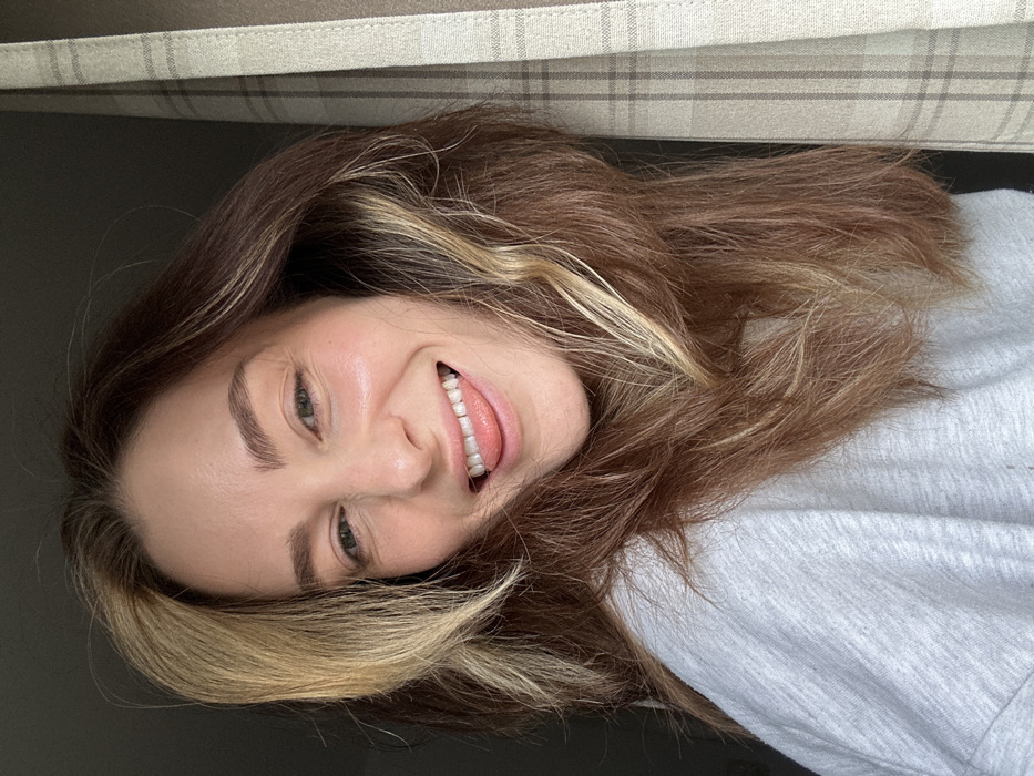 A close-up image displays a female individual in an indoor location in Unknown, Unknown. The subject has long, wavy brown hair with blonde highlights, particularly on the frontal sections. She wears a light grey, textured, long-sleeved top. Her face is directed towards the camera, featuring a wide smile that reveals her teeth, and her tongue is slightly extended past the lower lip. Her eyes are green and appear slightly narrowed. The background is dark and indistinct on the left side of the frame. On the right, a vertical section of a light-colored, plaid-patterned curtain, with brown grid lines, is visible. The scene is illuminated by front-facing light.