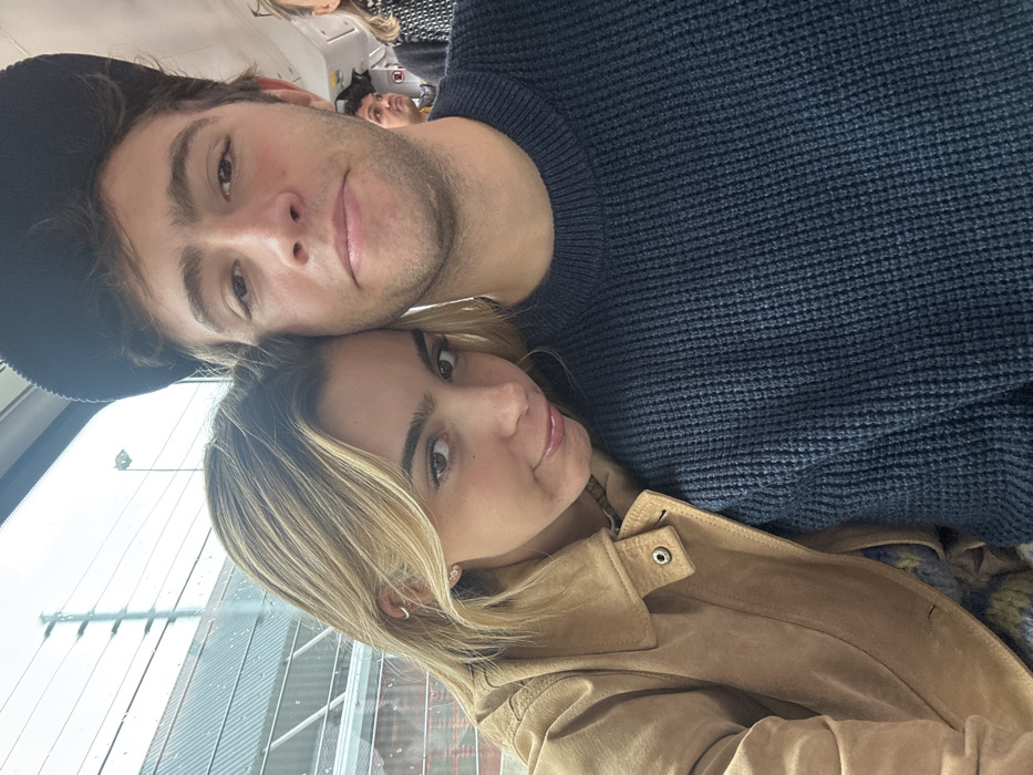 This image captures two individuals inside a passenger train or tram in the city of Schiphol, Netherlands. The foreground features a male subject on the right and a female subject on the left, both looking directly at the camera. The male wears a dark cap and a dark blue knitted sweater, displaying a neutral expression, with short brown hair and light stubble. The female, with long blonde hair and multiple ear piercings, leans her head against the male's shoulder. She is dressed in a tan suede-like jacket over a partially visible patterned garment and exhibits a slight smile. Behind the subjects, a large window is obscured by numerous water droplets, indicating precipitation. Through the window, an exterior scene shows a structure with horizontal corrugated metal siding and a utility pole with a light fixture. In the background inside the vehicle, a third male individual is partially visible looking away from the camera, and a fourth female individual is partially visible on the far right. A red emergency handle or door release is visible further within the cabin.