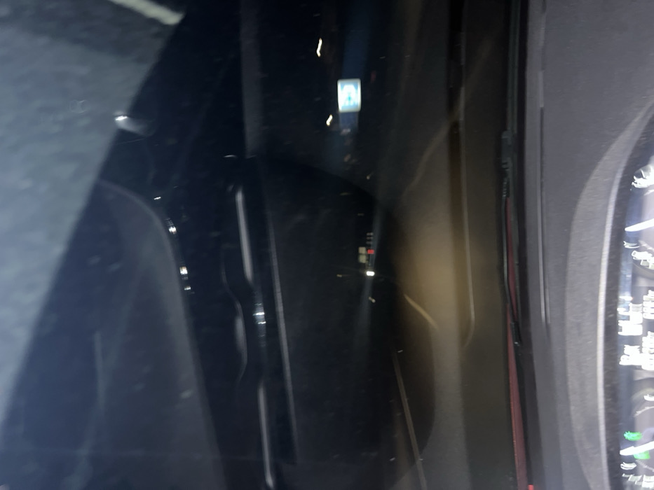 dashboard of a car from the driver's perspective, taken at night. A blurred reflection of a street sign is visible on the windshield. The car's instrument panel is partly visible on the right side of the image, showcasing the speedometer and other gauges. A red wire or cable runs along the edge of the dashboard. The overall lighting is dim, contributing to a sense of depth within the vehicle's interior.