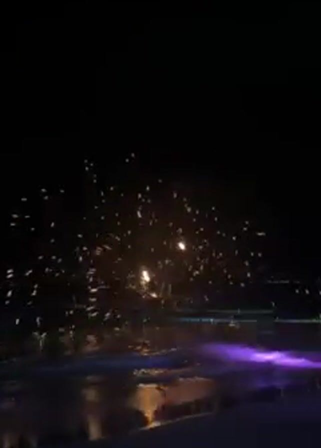 person performing a fire dance at night, possibly on a small platform in the water. The individual is holding what appears to be two flaming torches. The light reflects off the water creating visible ripples. The background is dark, with only the sparks and flames clearly visible. The audio includes music.