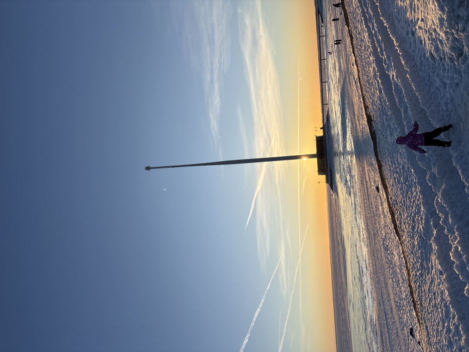 The image depicts a winter scene at sunset or sunrise over the frozen Gulf of Finland, specifically in the Park of the 300th Anniversary in Saint Petersburg, Russia. The sky transitions from a deep blue overhead to a bright orange and yellow horizon, where the sun is low. Multiple white contrails from aircraft crisscross the upper sky, and a faint crescent moon is visible to the left of the prominent flagpole. In the foreground, a lone child, dressed in a purple hooded jacket and dark pants, stands on a snow-covered bank with their back to the viewer, facing towards the water. The snow around the child shows several parallel tracks or impressions. The midground is dominated by a wide expanse of snow and ice covering the frozen Gulf of Finland. In the central background, the very tall, slender Flagpole of the 300th Anniversary of the Russian Navy rises from a dark, silhouetted architectural base structure. The setting sun is positioned directly behind this base, creating a distinct sunburst effect. A long, dark pier or bridge extends from the right side of the frame into the frozen water. Several small, silhouetted human figures are scattered across the ice and near the pier in the distance, appearing to walk or engage in recreational activities. The flagpole casts a long, dark shadow diagonally across the frozen surface towards the foreground.