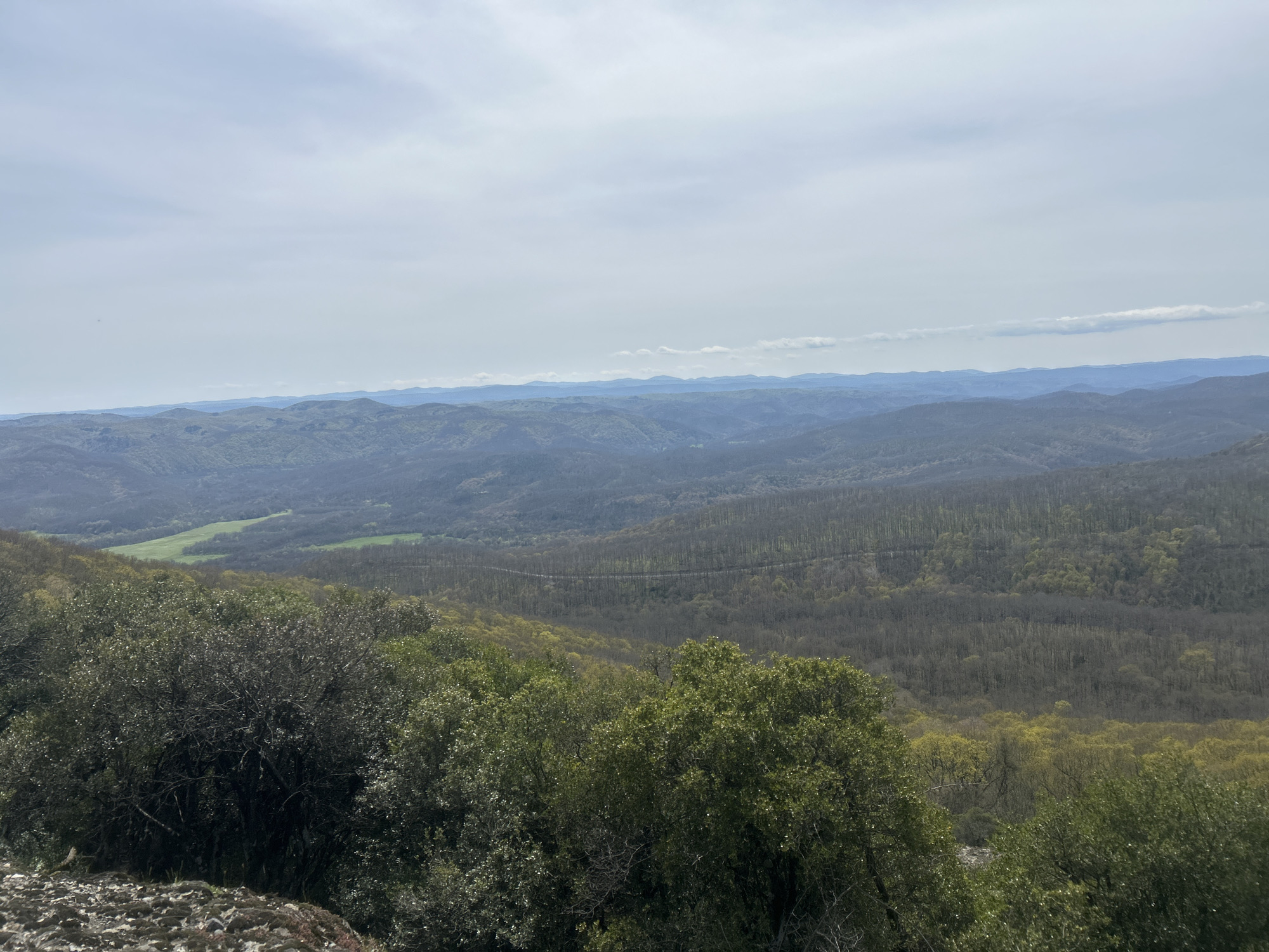 landscape view from a high vantage point, potentially in the area of Izgrev, Bulgaria, although no specific landmarks confirm the location. The foreground features dense green trees and rocky terrain. The middle ground consists of a valley with a visible road cutting through the landscape. Patches of green meadows are interspersed within a forested area that shows signs of possible deforestation or forest fire damage, with many bare trees present. The background reveals distant mountain ranges fading into a light blue and cloudy sky. No people or animals are directly visible in the frame. The light suggests it is daytime.