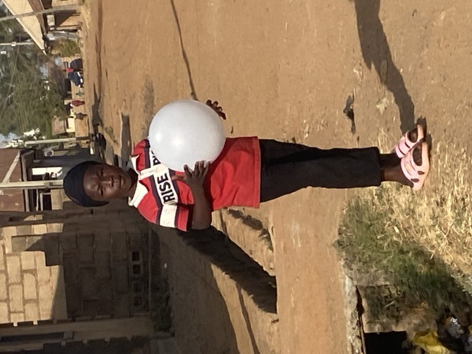 A child in a red shirt with “RISE” printed on it stands on a dusty path holding a large white balloon. The child wears a black head covering and black pants and pink sandals. The scene is outdoors, with buildings and a glimpse of other people in the background. The photo is taken in bright daylight, casting a strong shadow of the child on the ground. The image appears to be rotated slightly.