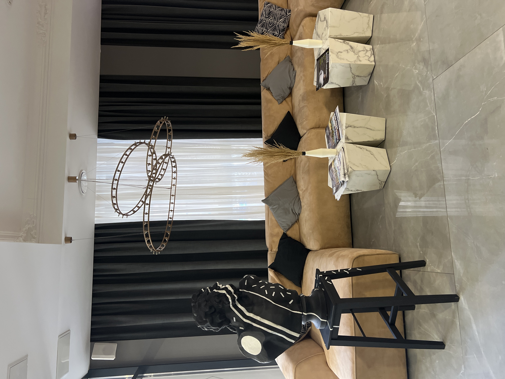 n interior space, likely a living room, with a modern aesthetic. The color palette is dominated by neutral tones, including beige, gray, black, and white. The floor is tiled with large gray slabs. A beige sectional sofa occupies a significant portion of the space, adorned with several pillows in gray, black, and patterned designs. On the sofa's side are two marble-like cube tables, each displaying decorative grasses in vases and magazines. A dark-colored sculpture of a bust, decorated with white stripes, is placed on a small black stool next to the sofa. The background features floor-to-ceiling windows covered with black curtains. An abstract, circular chandelier hangs from the ceiling in front of the window. Based on the submission information, the image is located in Rostov-on-Don, Russia.