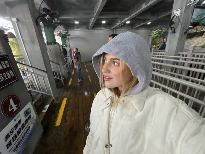 woman with a gray hoodie and white jacket standing in what appears to be an indoor waiting area with metal railings and flooring marked with yellow lines
