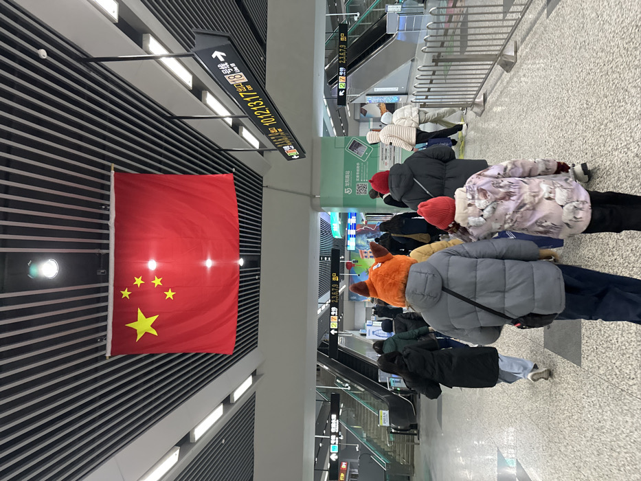 The image depicts a crowded indoor public transit area, specifically identified as Longyang Road Station in Pudong, China, based on visible signage. The scene is illuminated by overhead linear and circular lights embedded in a modern slatted ceiling. A large red Chinese national flag, featuring one prominent yellow star and four smaller yellow stars, hangs centrally from the ceiling. Numerous individuals are observed walking forward, primarily from a rear perspective, indicating movement through the station. Most are dressed in winter attire, including heavy coats and hats. A prominent person in the foreground wears a grey puffer jacket and an distinctive orange animal-themed hat, possibly a fox, with a black cross-body bag strap. To their right, a child or shorter adult wears a light-colored patterned jacket and a red knit beanie. Another individual in a black coat and red beanie is visible further back. The environment includes light-colored speckled floor tiles. On the left, a set of escalators ascends, while another is partially visible on the right. Multiple black hanging signs with white and yellow text provide directional information. One sign points right with an arrow and lists "出口 Exit 10,12,13,17" and "Line 18." Another sign to the left indicates "出口 Exit 2,3,6,7,9." Green-hued informational screens, one displaying a QR code, are visible in the mid-ground. Metal railings line the right side of the walkway, separating it from an adjacent area.
