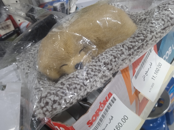 The image displays a light brown, fur-covered plush toy resembling a sleeping animal, possibly a dog or bear cub, curled up with its eyes closed. The toy is enclosed in clear plastic packaging and rests on a patterned, grey and white fleecy material. It is situated within a cluttered retail environment, likely a store or storage area, among other packaged merchandise. Prominent in the foreground are two white price tags. One tag, partially obscured, shows a barcode, "فیش مسطح الشی", "11,160.00", and the date "4-11-2025". Another tag features a red "SOROKA" logo, a barcode, "فیش مسطح", and "1,160.00". Various other items, some in clear plastic, are visible in the blurred background, including white, red, black, and blue objects. The location is the city of Unknown, Unknown.