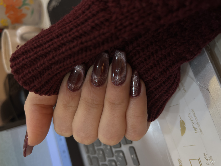 A human left hand is positioned in an indoor workspace. The hand displays five visible fingernails (thumb, index, middle, ring, and pinky) each featuring long, oval-shaped artificial extensions. The nails are painted in a deep maroon or reddish-brown color with a distinct silver-white glitter "cat eye" effect diagonally across each nail. The hand is partially encased by the ribbed cuff of a maroon knitted garment, likely a sweater or similar clothing item. To the left, a silver-colored laptop is partially visible, showing gray keys on its keyboard and a light-colored interface on its screen. A white product label, partially obscured beneath the hand, displays text including "Lightweight" and "Extremely portable." The background is out of focus, revealing a plain light-colored ceramic mug and another container with an orange floral pattern, alongside a dark, indistinct object. The overall scene is located in Sarouja Municipality, Syria.