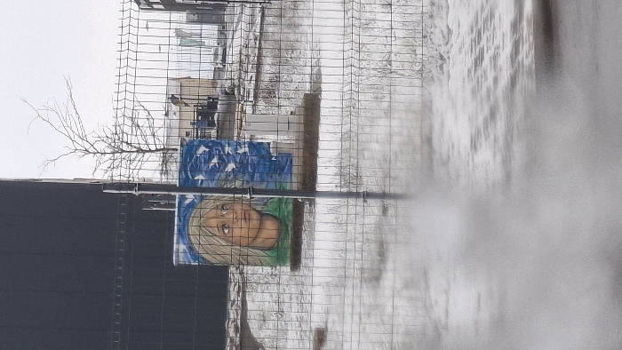 The scene depicts a winter urban landscape in Sanem, Luxembourg. The foreground is blurred, appearing as a translucent, frosty or misty layer. A grey wire mesh fence traverses the midground, with a black vertical metal post positioned centrally in front of it. Behind the fence, a rectangular utility box is adorned with a mural. The left side of the mural portrays a young child's face with light-colored hair and upward-looking light eyes, wearing a green garment. The right side features an abstract pattern of blue and white shapes. To the right of the painted box, a smaller, white rectangular utility unit stands on the ground. The ground behind the fence is covered in patchy snow and sparse, dry vegetation. In the background, a dark, rectangular building is visible on the far left. A bare deciduous tree stands centrally against an overcast sky. Further to the right in the background, additional buildings, possibly residential or industrial, are discernible, also surrounded by snow. No people are present.