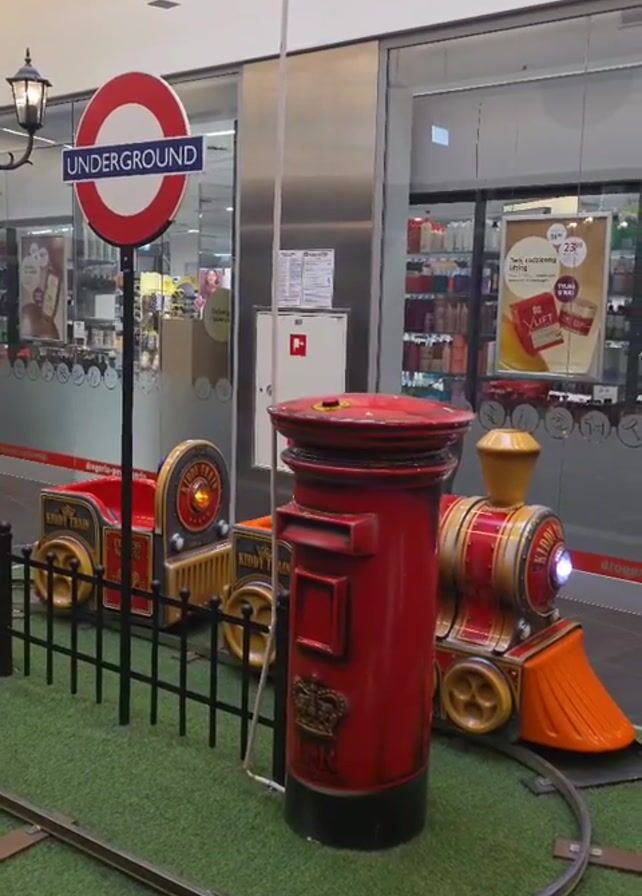 The camera captures a stationary Kiddie Train in an indoor setting, likely a shopping mall. The train, consisting of an engine and a carriage, is positioned on a small, circular track laid out on artificial grass. Adjacent to the train is a red, cylindrical British-style post box. Above, an "Underground" sign, reminiscent of the London Underground logo, is prominently displayed. A black, wrought-iron fence surrounds the display, adding a touch of formality. In the background, the storefront of a beauty and cosmetics shop is visible behind glass doors. The scene appears to be a whimsical recreation of a London street scene, intended to attract children and shoppers.