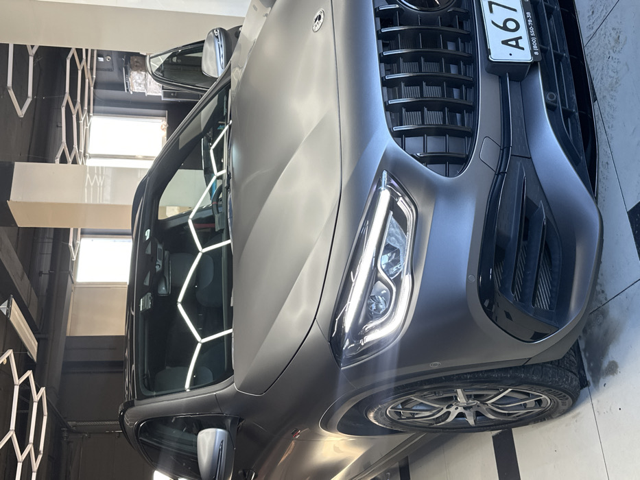 A matte grey Mercedes-Benz GLA-class (likely AMG variant) is depicted indoors, angled toward the viewer, showcasing its front left quarter. The vehicle features illuminated LED headlights and a vertical-slat grille. A Russian license plate, displaying "A67XOO" and the Saint Petersburg region code "78" or "178" in the upper right, is affixed to the front bumper. The phone number "8 (800) 550-78-38" is also visible below the primary registration. The passenger-side door is open. The setting is a commercial interior, likely a car detailing or service bay, characterized by a tiled floor with some moisture evident, a dark ceiling with hexagonal LED light fixtures, and prominent white support columns. Large windows provide ambient natural light, and indistinct stacked items are visible in the background, suggesting a workspace. No individuals are present in the frame. The precise location is within Saint Petersburg, Russia, as indicated by the license plate's region code.