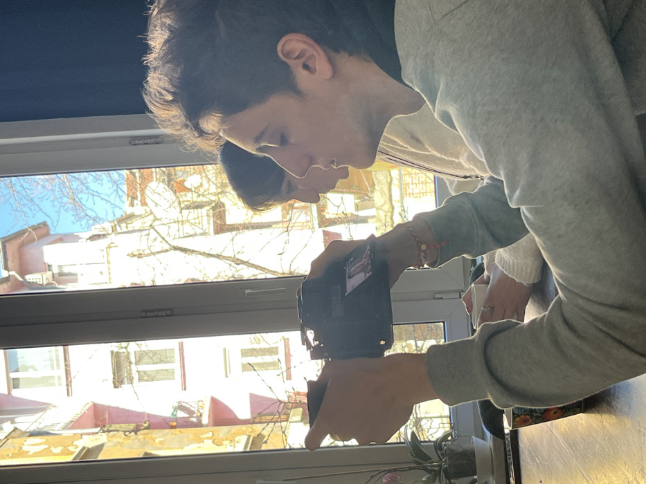 An indoor, side-angle shot depicts two individuals at a dark wooden table, illuminated by natural light from a large window. In the foreground, a young adult with dark curly hair, wearing a grey hooded sweatshirt, holds a black digital camera horizontally with both hands. A red and white string bracelet is visible on their left wrist. The camera's flip-out screen is extended, displaying a visual. Behind and slightly to the left, a second young adult with dark hair is partially visible in profile, wearing a light-colored knitted garment. This individual holds a white cup with their left hand, on which a ring is visible. A patterned mug rests on the table. Through the white-framed window, the exterior environment of Sofia, Bulgaria, is visible. It features multi-story residential buildings characterized by weathered facades in shades of pink and yellow/ochre, with visible balconies. Bare tree branches are prominent against a clear blue sky. A potted orchid with purple blooms is situated on the left windowsill.