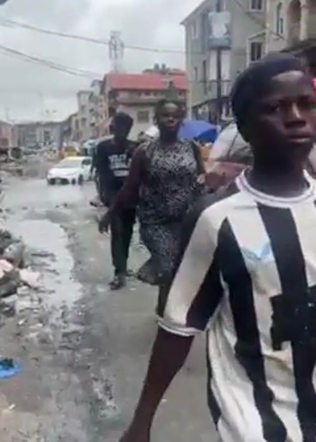 busy street in an urban environment. The road is dirty and wet, with puddles of water and trash. Several people are walking and running along the street. The people in the video are wearing casual clothing. There are cars parked on the side of the road and a variety of buildings. Some stalls are set up along the street, presumably for selling goods. The sky is overcast.