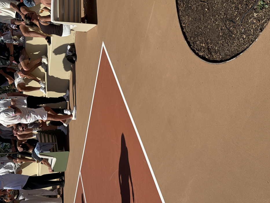 An outdoor gathering on a brown surface marked with white triangle patterns. People, including seated individuals, are situated along the edge. To the right, there's a circular patch filled with dark soil and possibly foliage. The scene is brightly lit, casting distinct shadows of people onto the surface.
