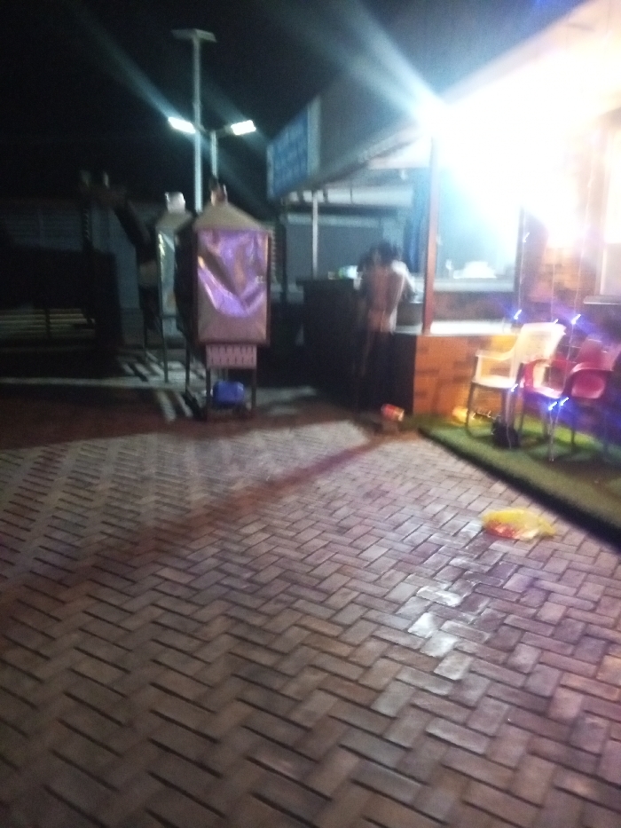 An outdoor nighttime scene shows a brick patio leading to a dimly lit food stall. A person stands behind the counter. A vertical structure with a light-colored cover sits nearby, casting a shadow on the ground. Two chairs are adjacent to the stall with blurred lights above. The street is dimly lit by a street lamp.