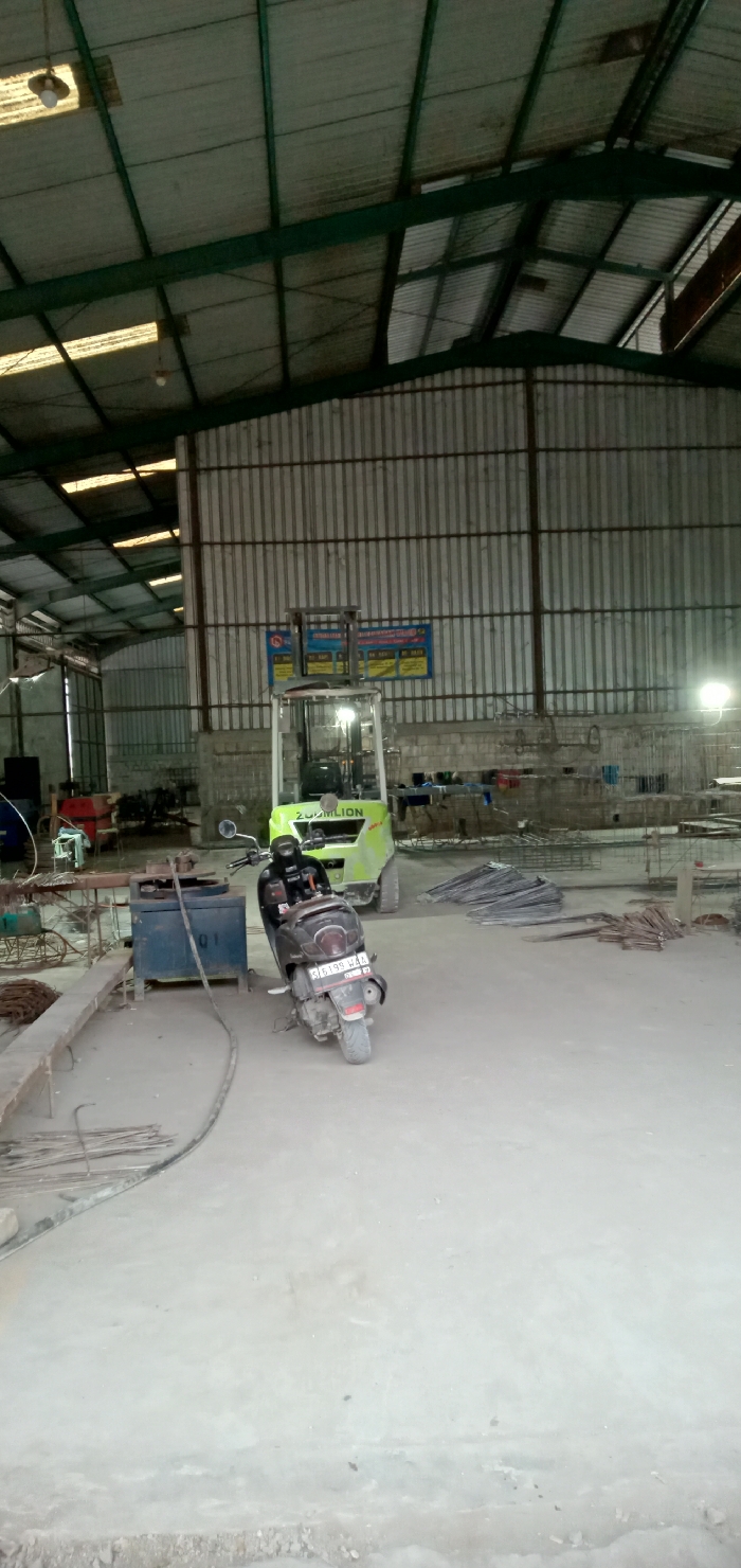 The image depicts the interior of a large industrial facility, consistent with a workshop or storage area, located in Sumput, East Java, Indonesia, as indicated by the "S 6199 WAA" license plate on a scooter