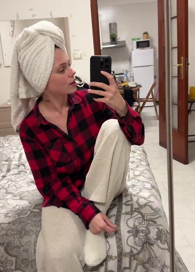 A young woman with a white towel wrapped around her head sits cross-legged on a bed in a bedroom. She is wearing a red and black plaid shirt and cream-colored pants. She holds a black smartphone in her right hand, taking a selfie. A mirror reflects the room behind her, showing a kitchen area with a white refrigerator and a table with various items on it. The bedroom has a dresser and a bed with a patterned grey and white comforter. The woman smiles and adjusts the towel on her head.