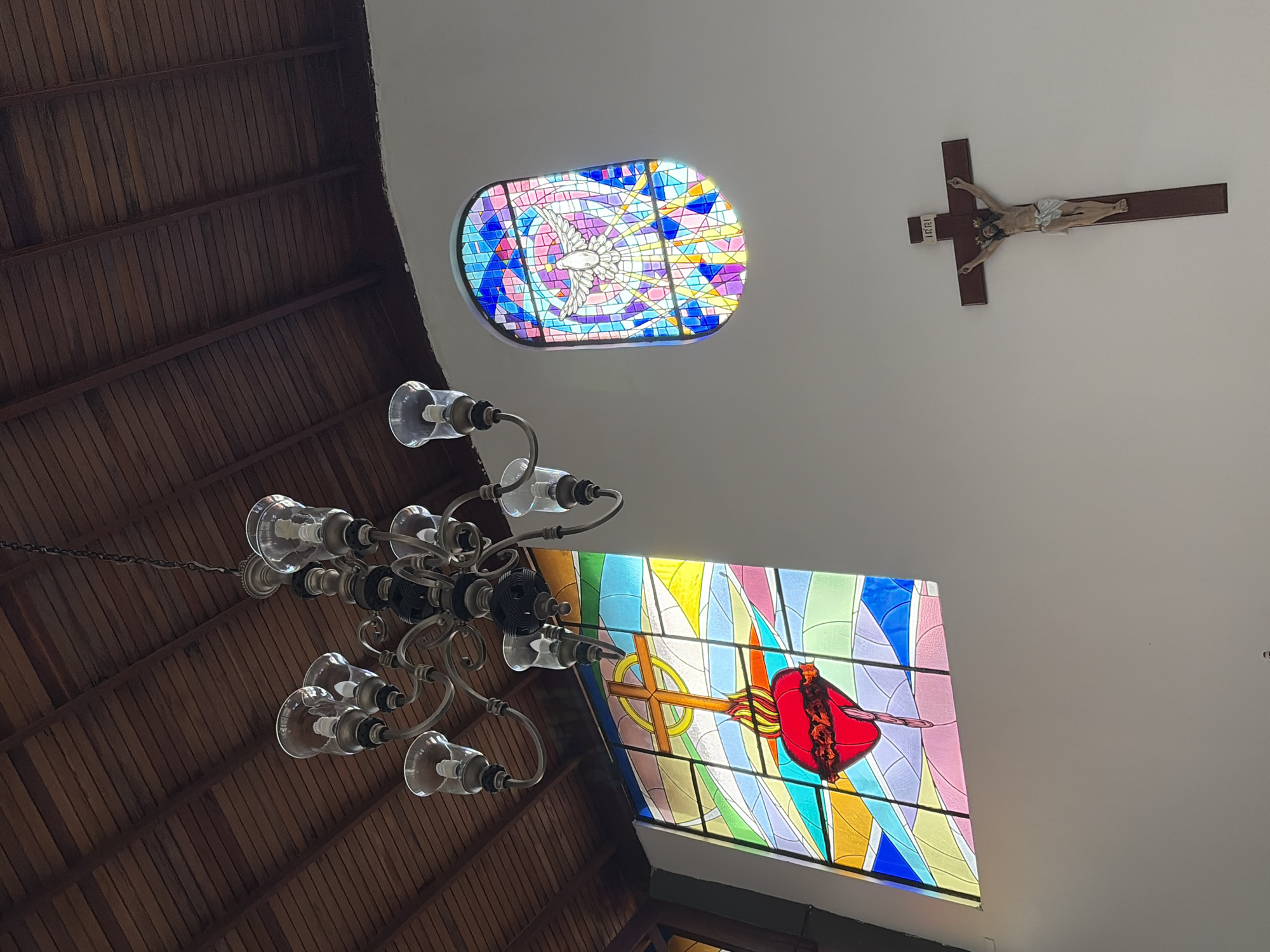The image depicts the interior of a religious building, identified as being in Guayana City, Venezuela. The scene features a high, dark brown wooden plank ceiling. Suspended centrally from the ceiling by a chain is a multi-armed metal chandelier with bell-shaped glass shades containing light bulbs. To the left, a large rectangular stained-glass window displays a stylized image of the Sacred Heart of Jesus, depicted as a red heart with flames and a cross above, all within a colorful geometric pattern. To the right of the chandelier, a smaller, arched stained-glass window illustrates a white dove with radiating lines, representing the Holy Spirit, also within a colorful geometric mosaic. Below the arched window, mounted on a plain light-colored wall, is a brown wooden crucifix featuring a depiction of Jesus (corpus) with "INRI" inscribed above. No people or active interactions are visible.
