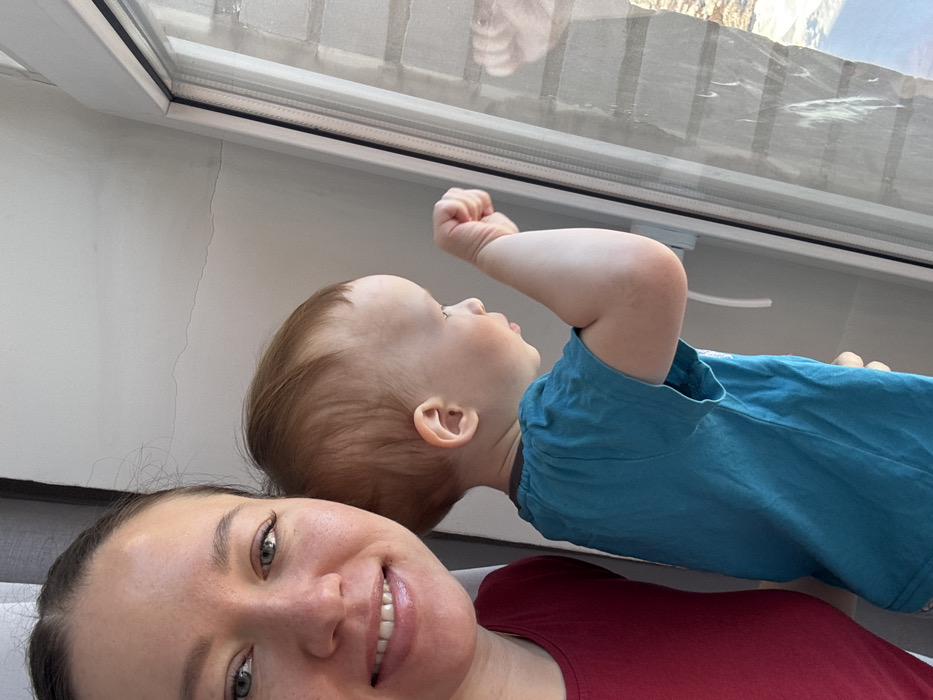 The image, captured in Gamovo, Russia, depicts an indoor scene featuring two individuals by a window. On the left, a woman with light skin and dark hair pulled back is visible from the chest up, smiling directly at the camera. Her left eye, with dark eyelashes, is clearly visible. She wears a plain red top. To her right, a young child, approximately toddler age, is positioned with their back mostly to the camera, facing right and looking out of a window. The child has light brown hair and wears a teal or blue short-sleeved shirt with a visible brown collar. The child's right arm is raised, with the hand clenched into a fist, positioned near the white frame of the window. The interior wall behind the child and above the window is light-colored (off-white or light grey) and exhibits a horizontal crack extending from the upper left towards the upper right. The white-framed window occupies the right side of the frame, revealing an indistinct outdoor view or reflection, possibly of a brick wall or building, suggesting daylight conditions outside.