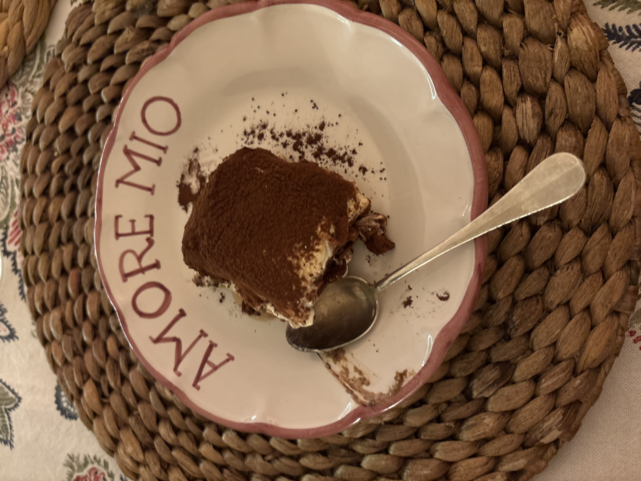 A piece of tiramisu sits on a plate with a pink scalloped edge, accompanied by a silver spoon. The dessert is dusted with cocoa powder. The plate reads "Amore Mio" in red lettering. The plate rests on a woven, round placemat with a textured surface. A patterned tablecloth peeks from the left side.