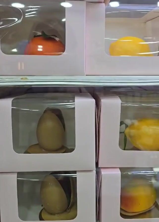 A display case holds various fruit-shaped desserts, each presented in individual pink-and-clear boxes