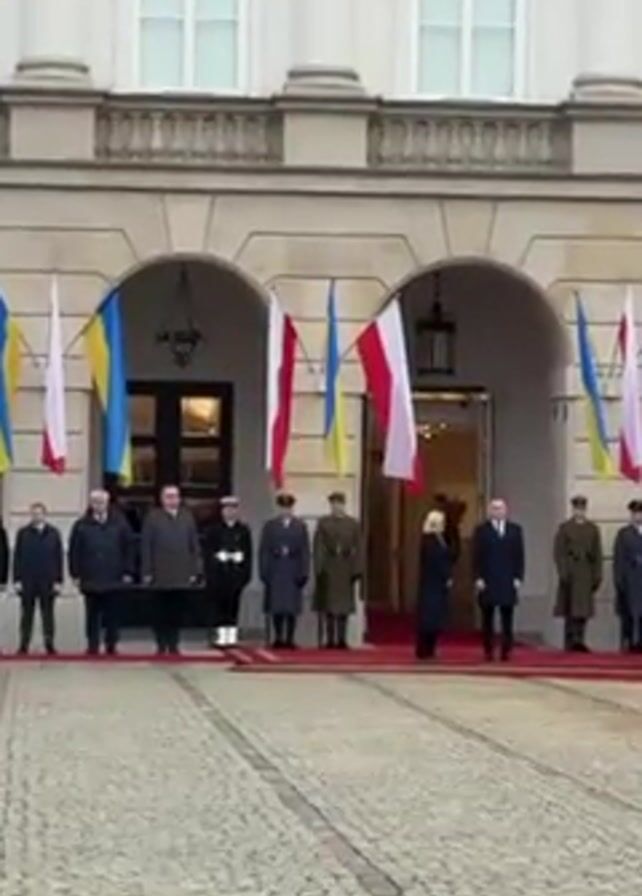 group of people standing outside a large, light-colored building adorned with Ukrainian and Polish flags. The scene takes place in a courtyard paved with light-colored stones. A red carpet is laid out in front of the building's entrance. Among the group, several individuals are in military uniforms, while others are dressed in formal civilian attire, including dark suits and coats. Two prominent figures, a man and a woman, stand on the red carpet, closest to the building's entrance. The environment is overcast, suggesting a potentially cold or gray day. The video provides a clear, wide shot of the entire scene, capturing the formality and potential diplomatic significance of the gathering.