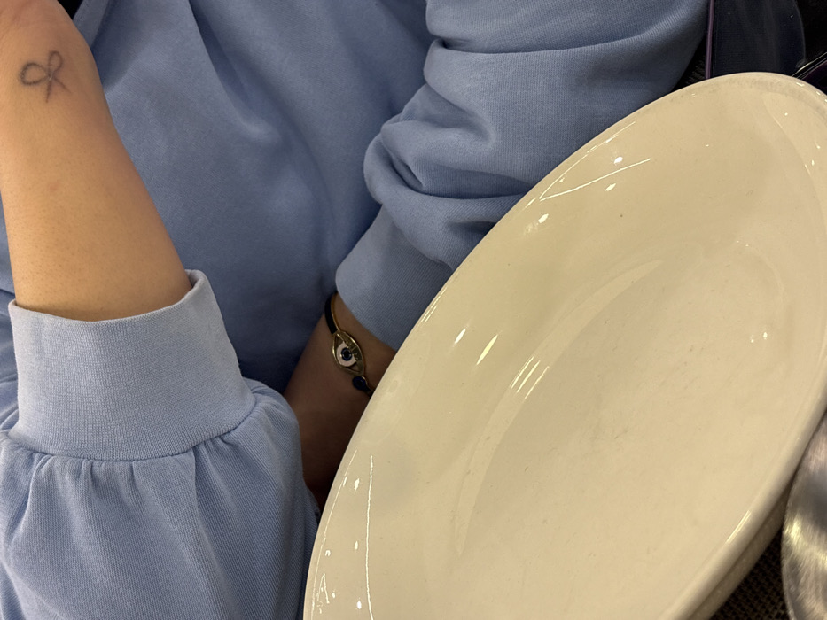 The scene captures a close-up of an individual's right arm, positioned near a serving dish, in Barza Municipality, Syria. The person is wearing a light blue, long-sleeved sweatshirt with ribbed cuffs. A bare forearm is visible, displaying a small, black-outlined bow-shaped tattoo on the upper portion. A gold-toned bracelet featuring a dark blue and white evil eye charm is present on the wrist. An empty, off-white, glossy oval dish occupies the lower-left and central foreground, with its rim partially obscuring the arm. The background behind the arm is dark and out of focus, suggesting an indoor setting.