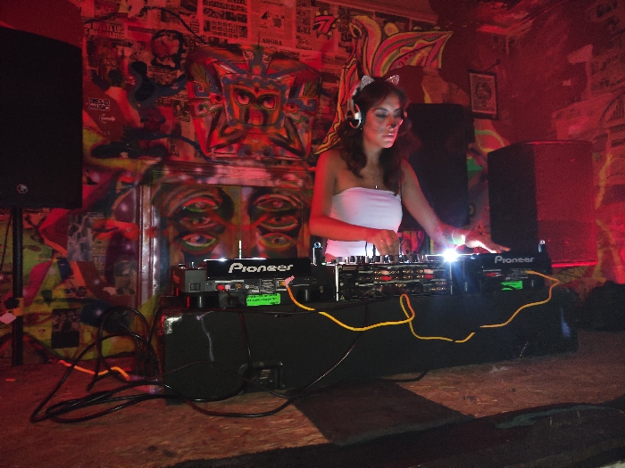 A DJ in a white strapless top and cat-ear headphones works at a Pioneer DJ setup. The booth sits atop a slightly elevated stage area, wires and cables snaking across its surface. Behind her, the wall is covered in colorful graffiti, posters, and abstract art. A black speaker stands to the left. Red lighting casts a warm glow over the scene.