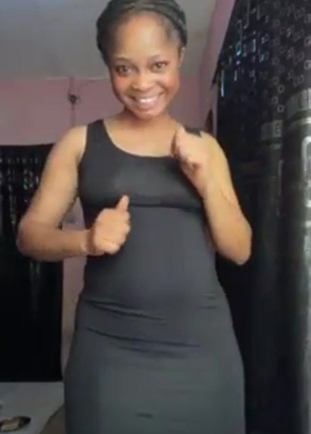 A woman stands indoors, facing the camera and smiling, wearing a black sleeveless dress. She has dark hair pulled back from her face. Her hands are up, held near her chest with her thumbs pointing upwards. Behind her is a bed with white sheets on the left and black patterned curtains on the right. The walls appear to be a light pink or beige color. There is a ceiling light visible. She seems to be moving slightly, perhaps swaying.