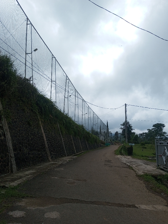 A paved road stretches into the distance under a cloudy sky. To the left, a high retaining wall made of dark stone rises with greenery sprouting atop, paralleled by a tall chain-link fence. Streetlights are affixed to the fence posts. Power lines stretch above. On the right side of the road is a grassy area with trees, partially obscured by a metal gate. The scene is overcast and appears to be rural.