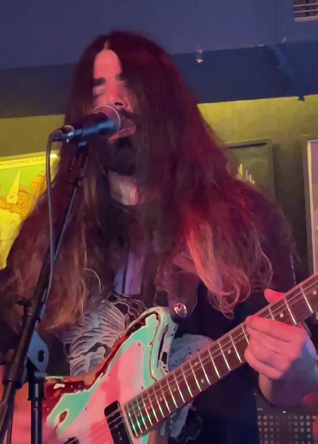 A long-haired man with a beard is singing into a microphone and playing an electric guitar