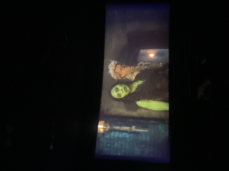 A vertically oriented image on a screen, likely a TV or tablet, features two figures. One figure has green skin and dark hair, while the other has lighter skin and blonde hair. Both appear to be reclining. A green object is near the green-skinned figure. A pale light is visible in the background above the figures, possibly a moon or light source. The surroundings of the screen are obscured in darkness.