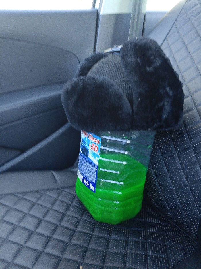 A black ushanka, a traditional Russian fur hat with ear flaps, is placed on top of a transparent plastic five-liter bottle. The bottle is approximately two-thirds full of a bright green liquid. A blue and white label on the bottle is partially visible, showing "Авто-доля" and "-30", indicating car windshield washer fluid rated for -30 degrees Celsius, and "5л" for five liters. This assembly rests on a black, quilted front passenger seat inside a vehicle. The dark gray interior door panel is visible to the left of the seat, and a portion of a seatbelt mechanism is seen behind the ushanka. The specific city of Novosaratovka, Russia, cannot be determined from the visual information present in the image.