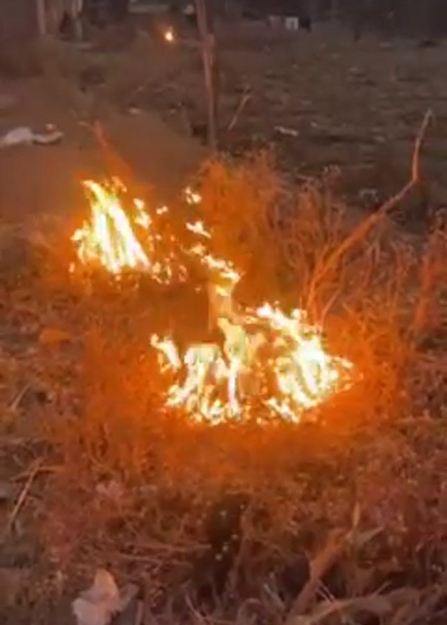 A low-angle, eye-level shot shows a bonfire burning in a grassy field against the backdrop of several houses, set against an overcast sky. The fire, composed of dry vegetation, features yellow and orange flames. The surrounding field contains dry grass, twigs, and scattered debris. In the distance, there are several houses, with one appearing to have laundry hanging outside. Another small fire burns farther away. A faint sound, perhaps human speech or vocalization, can be heard at the end of the video.